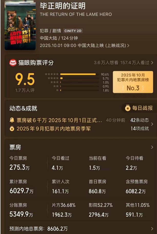 比拟之下,有两部小成本的剧情片,正在评价上反而脱颖而出,成为档期内亮点。它们别离是《振聋发聩》和《毕正明的证明》。前者上映仅8天,便斩获了1。9亿票房,成为国庆档唯逐个部盈利的片子。虽然其投资较小,但全体质量较高,排片量也达到了12%。相较之下,《毕正明的证明》虽然排片不到8%,明显,仍有一部门不雅众正在为其买单。