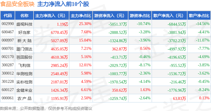 从资金流向上来看,当日食物平安板块从力资金净流入127。73万元,逛资资金净流入6440。41万元,散户资金净流出6568。13万元。食物平安板块个股资金流向见下表: