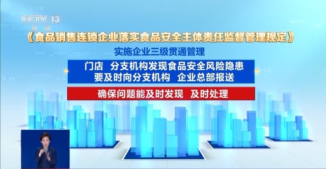 同时,《》要求实施企业贯通办理。企业总部、分支机构、门店均要成立并实施“日管控、周排查、月安排”工做轨制和机制,强调风险消息上下贯通,门店、分支机构发觉食物平安风险现患要及时向分支机构、企业总部报送,确保问题能及时发觉、及时处置。